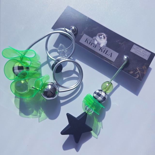 光を受けて、静かに存在感を放つ ネオンイエローのモードアクセサリー。 透明感のあるアクリルパーツに、 メタリックボールとチェック柄を組み合わせ、 Kira KiLAらしい「光と造形」を意識して仕立てました。 見た目に反してとても軽く、 長時間身につけても疲れにくいのも特徴です。 シンプルなコーディネートに合わせるだけで、 装いの印象を一段引き上げてくれる一点。 ✔ 個性的なアクセサリーが好きな方 ✔ 人と被らないデザインを探している方 ✔ モード・アート・ネオンカラーがお好きな方におすすめです。 ※ピアス/イヤリング金具の変更が可能です ※一点一点手作業で制作しているため、個体差があります。 金属アレルギーの方にも安心してお使いいただけるよう、チタンポストを使用しています。 (着画のピアス金具はテスト用です。新品に付け替えておりますのでご安心下さいませ) 【スペック】 大モチーフ 約8×3.8㎝ 小モチーフ 約8.0㎝ 【検索キーワード】 モード系 ポップ 可愛い PVC チタンピアス 異素材MIX ユニーク 個性的 金属アレルギー対応 カジュアル おしゃれ デイリー イベント プレゼント ギフト
