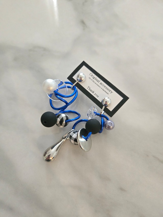冷たいのではなく、澄んでいる。 立体的に絡むブルーワイヤー。 揺れるたびに光を拾うクリアパーツ。 その奥に潜む、黒のレース。 甘さではなく、構造で魅せる。 揺れと光で印象を残す、 主役級アクセサリー。 __________________________ ワイヤーを一本ずつねじり、 線を描くように形づくった立体モードピアス。 無機質さと軽やかさを併せ持つデザインに仕立てました。 角度や光の入り方によって印象が変化します。 存在感のあるデザインですが、 見た目よりも軽く、長時間でも着けやすいサイズ感です。 左右で表情の異なるアシンメトリーデザインのため、 どちらの耳に着けてもバランスよくお楽しみいただけます。 ✔ 人と被らないアクセサリーを探している方 ✔ モード・アート感のある装いがお好きな方 ✔ 量産品では物足りない方におすすめです。 【スペック】 大モチーフ 約8,3×4㎝ 9g 小モチーフ 約8㎝ 5,4g 【検索キーワード】 モード系 チタンピアス 異素材MIX ユニーク 個性的 金属アレルギー対応 カジュアル おしゃれ デイリー イベント プレゼント ギフト