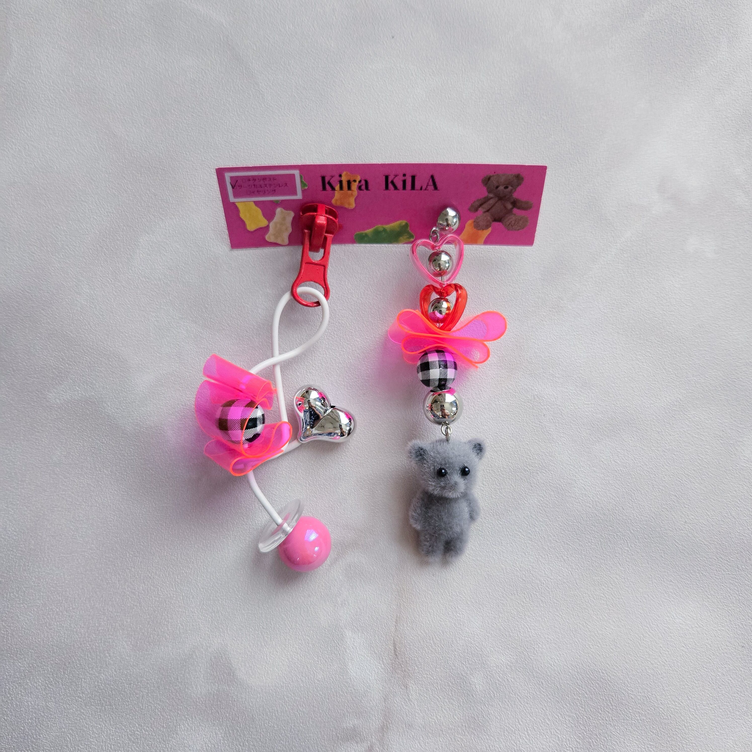 ファスナーとくまちゃんがアクセントのキュートなピンクのおおぶりピアス。