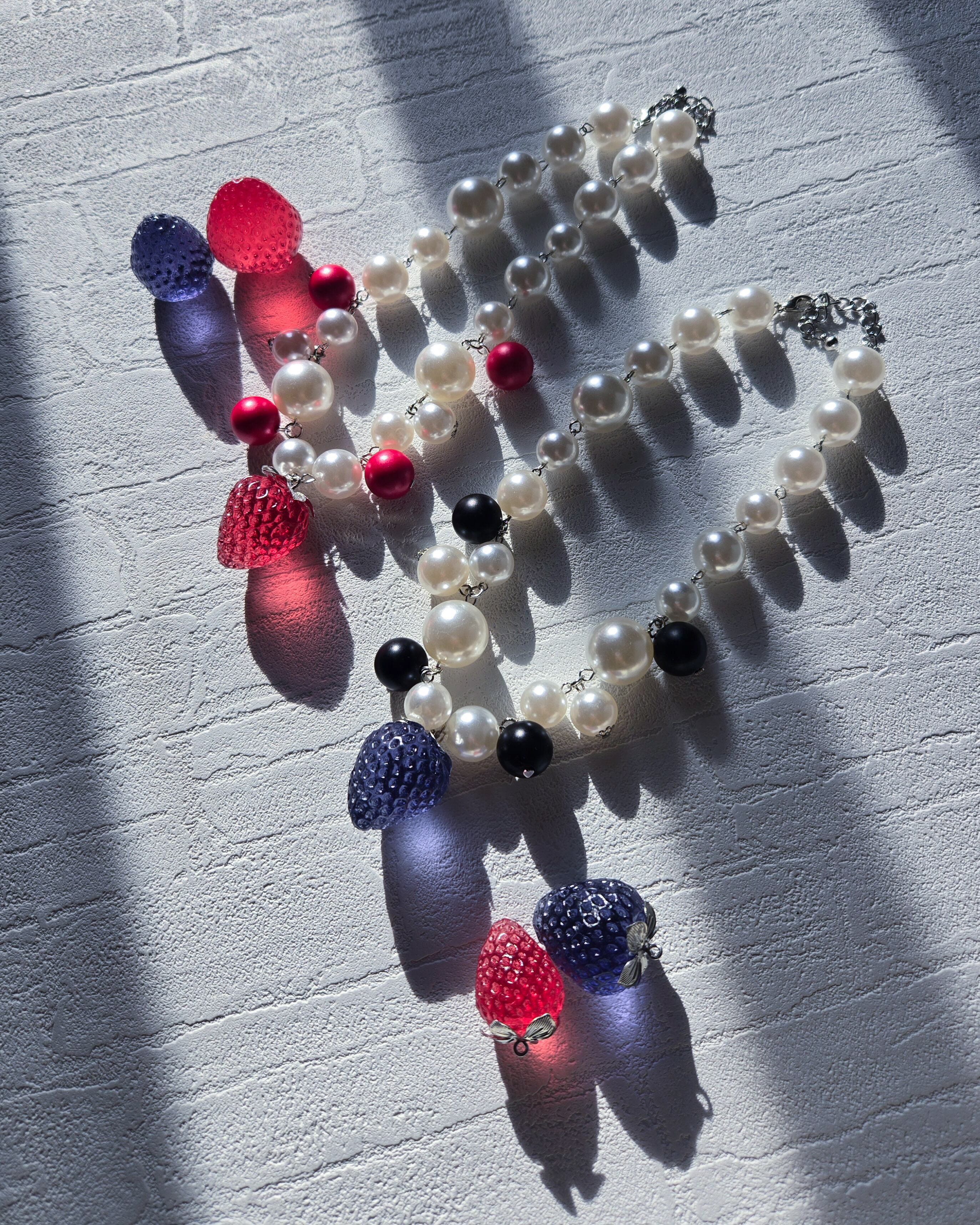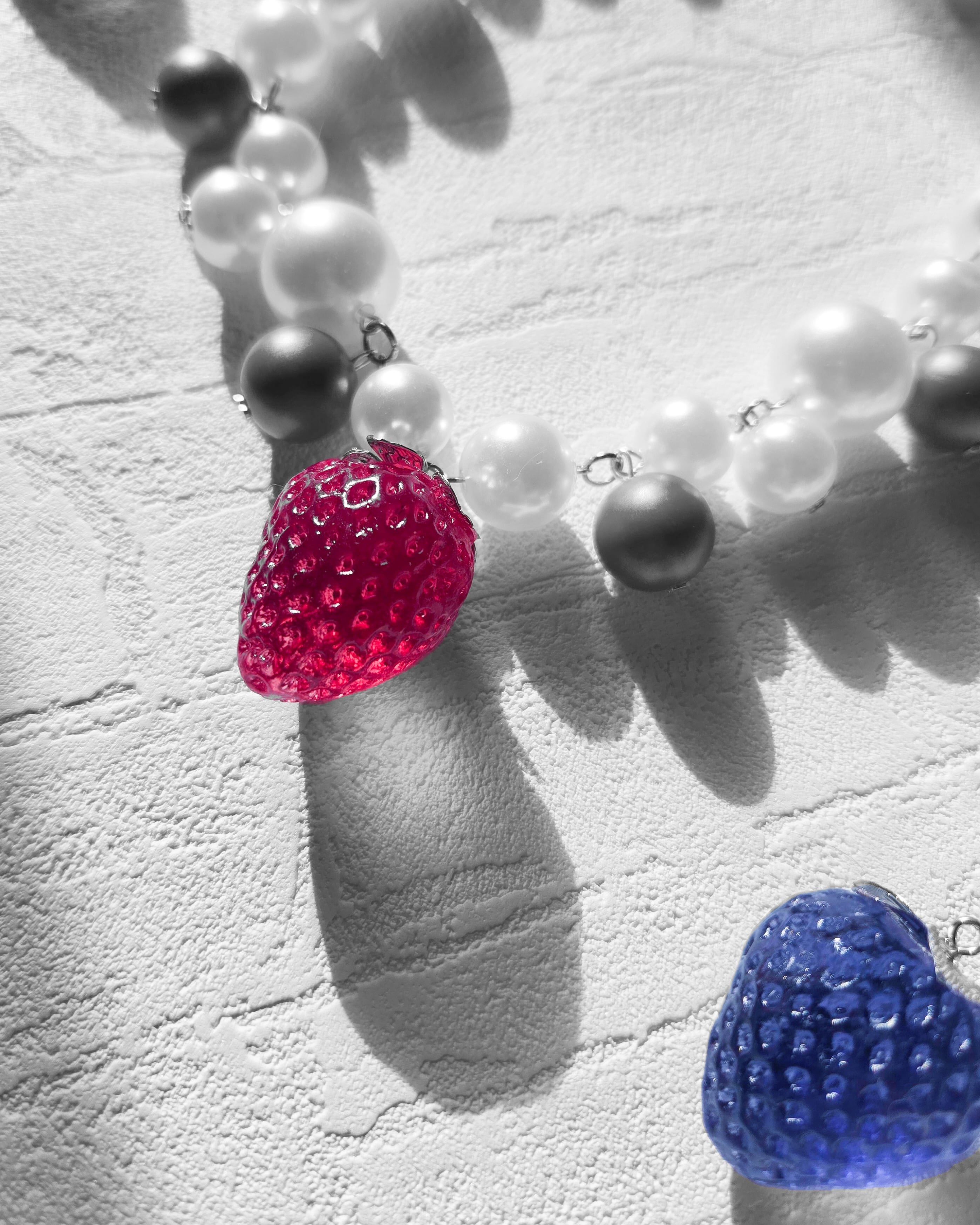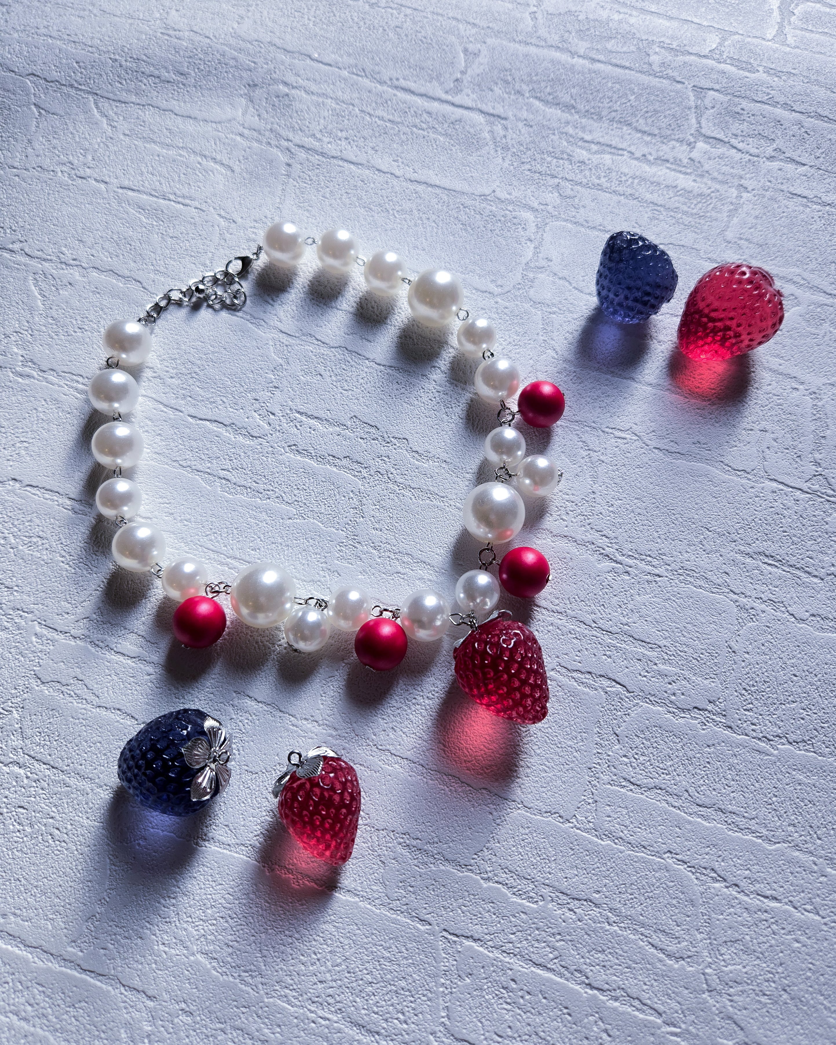 一点物のフェイクパールを使った苺モチーフのネックレス。