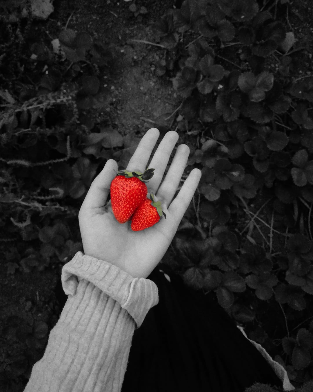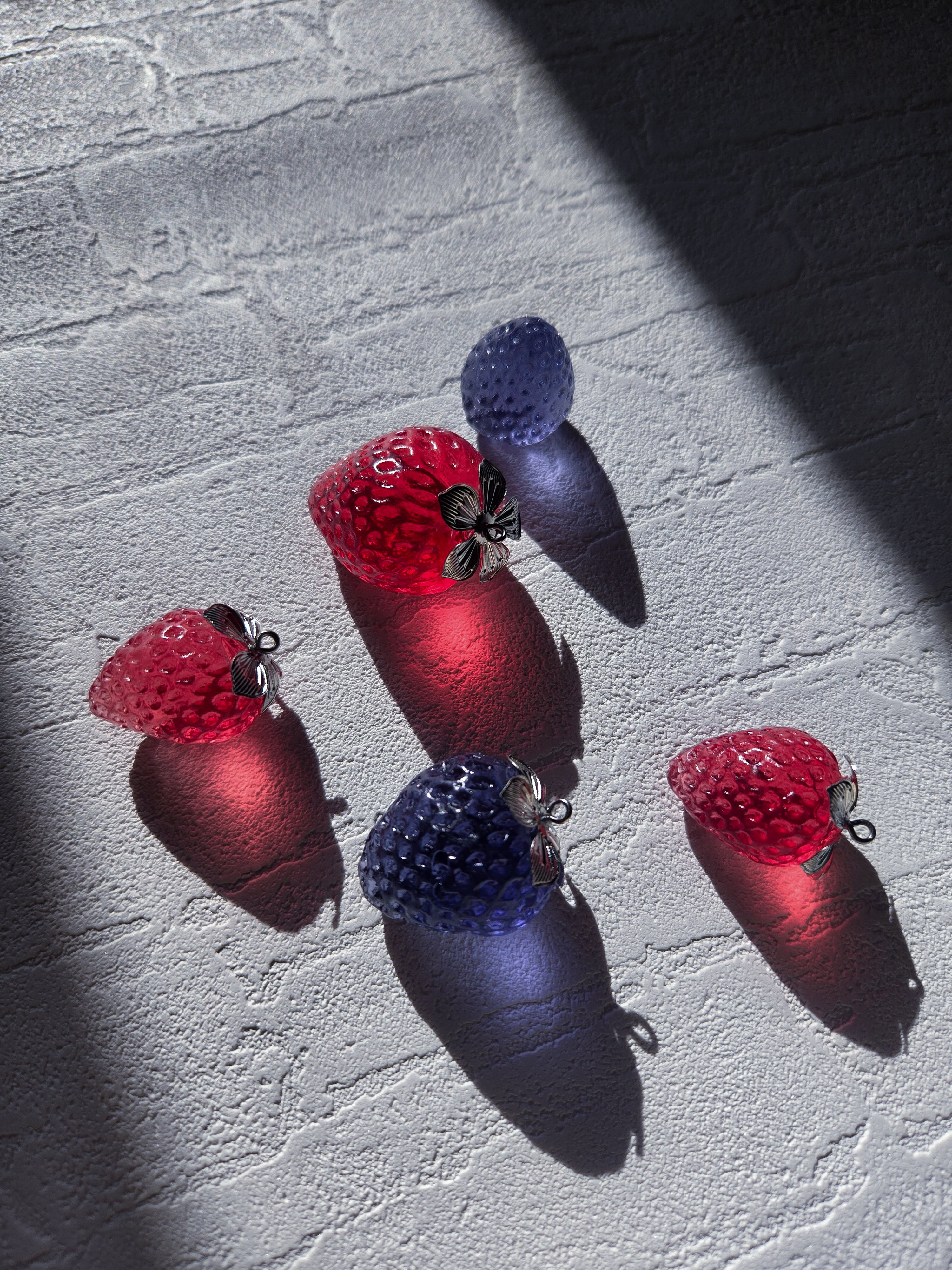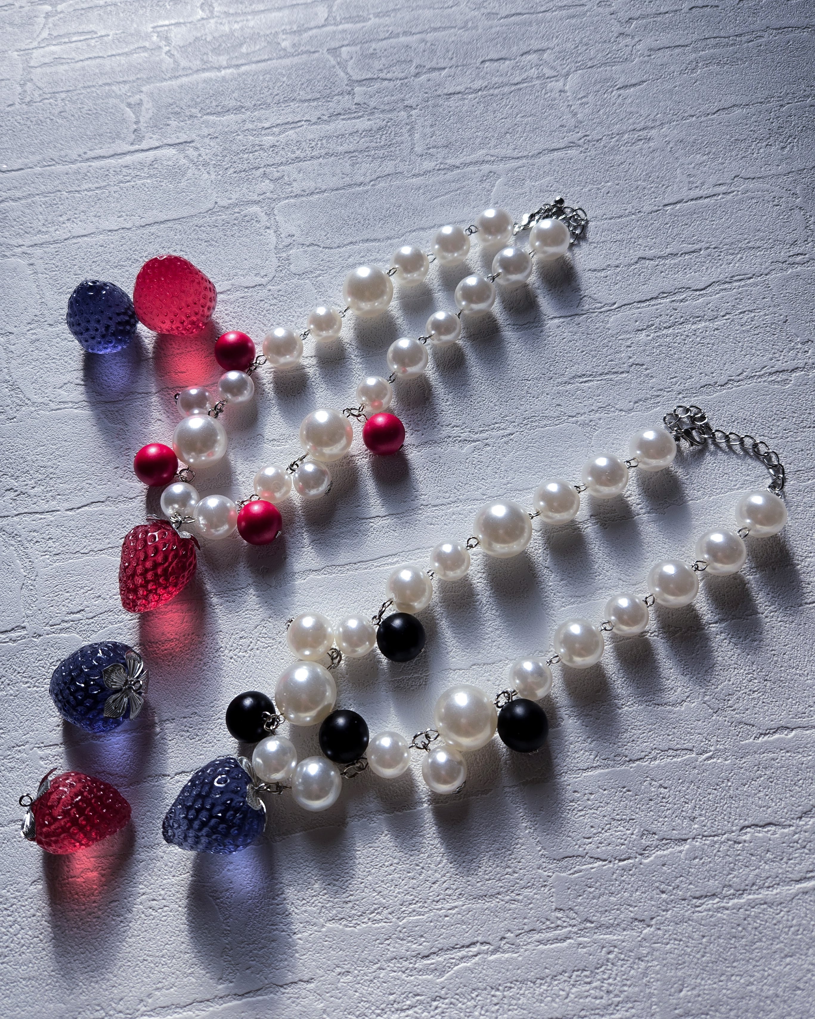 一点物のフェイクパールを使った苺モチーフのネックレス。