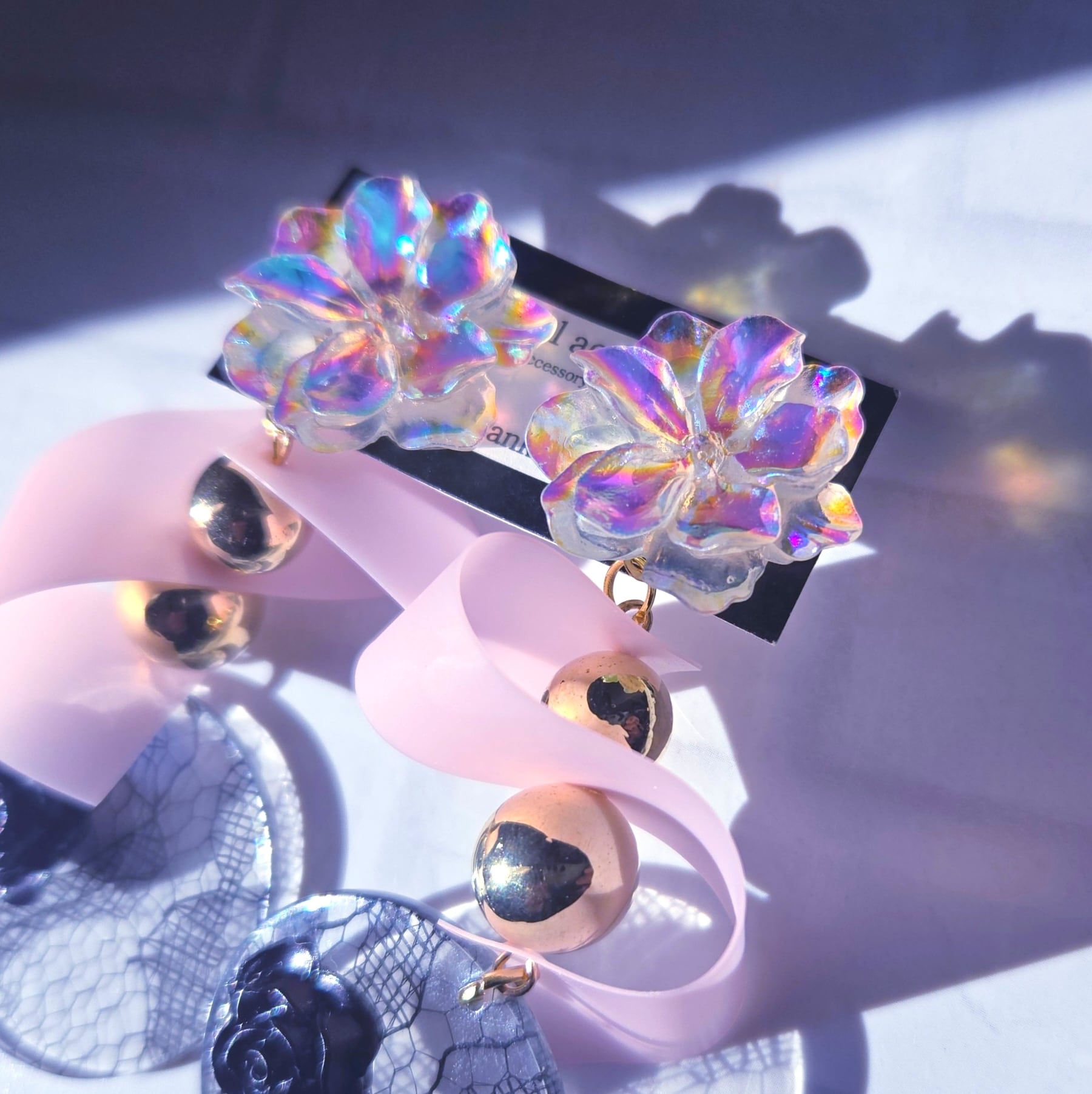 フェミニンなプラスチックレースとオーロラフラワーが優雅に重なり、